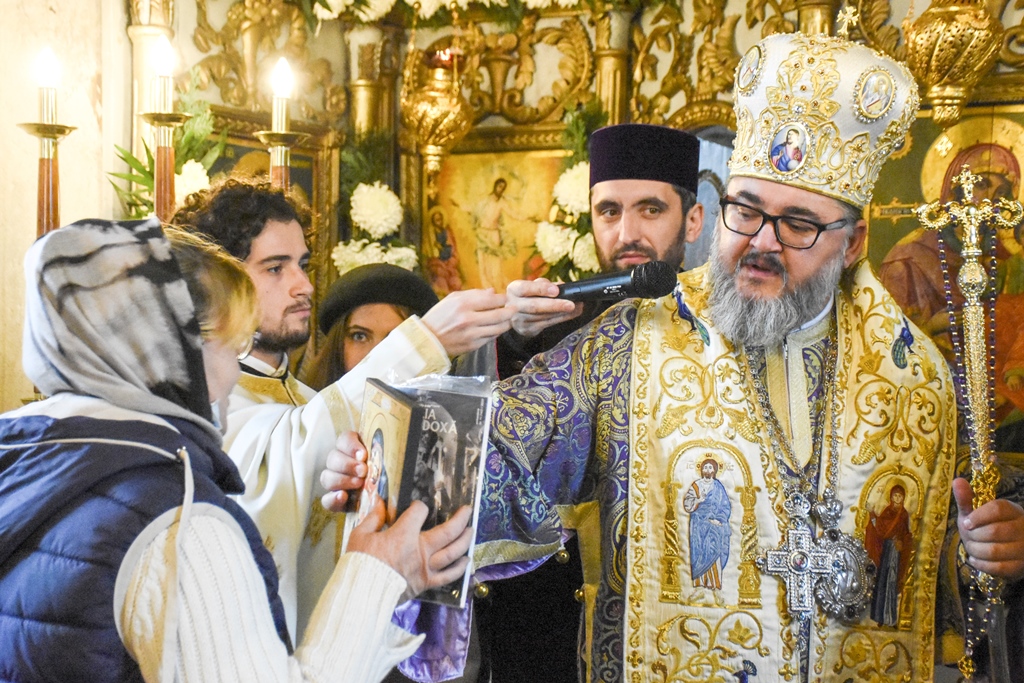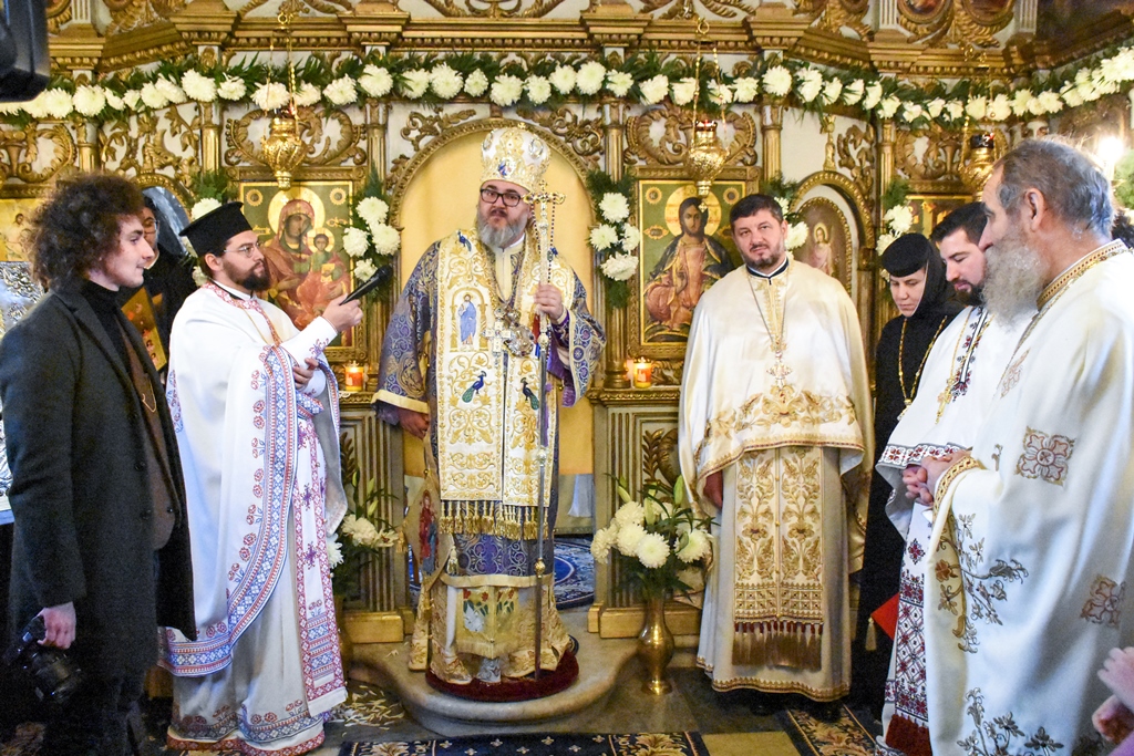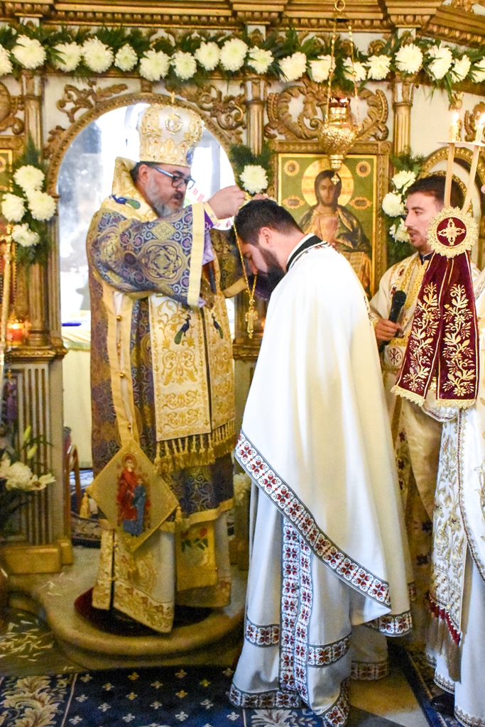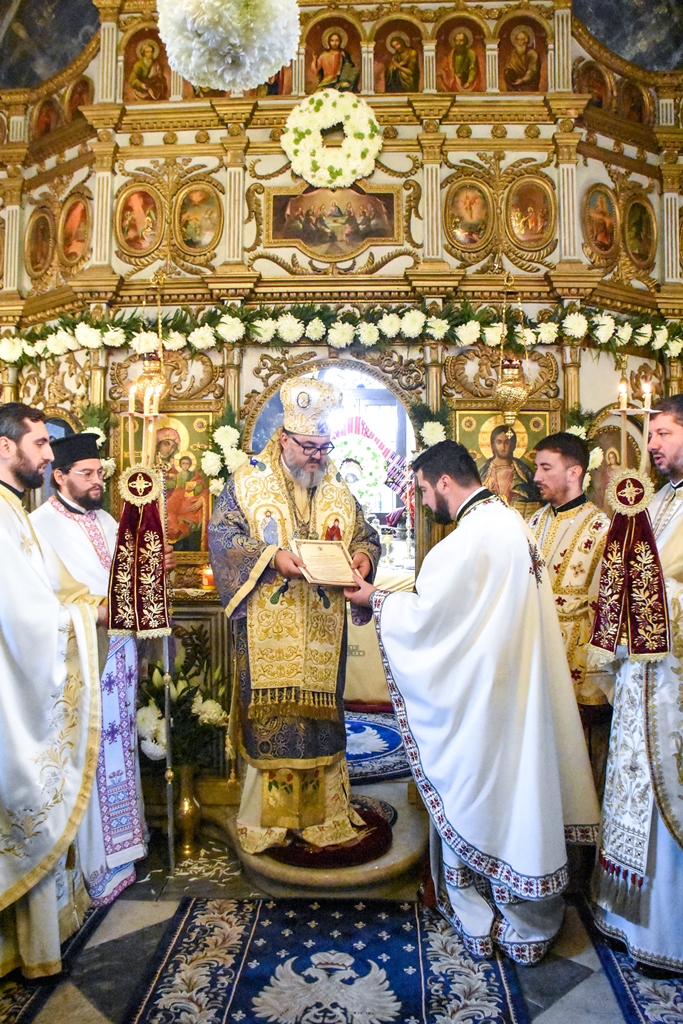 Chiriarhul nostru a mulțumit părintelui Alexandru Mirel Lăudat, pentru amplele lucrări făcute în curtea bisericii și pentru buna organizare a hramului, hirotesindu-l iconom stavrofor, felicitându-l și pentru activitatea duhovnicească. La rândul său, părintele i-a mulțumit Preasfințitului Părinte Episcop Ambrozie, oferindu-i un frumos coș cu flori.